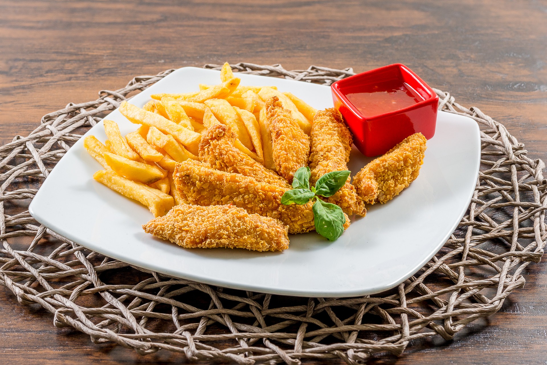 Meniul conține: pui crispy (200 g), garnitură (150 g), și sos chilli dulce / iute (50 g)